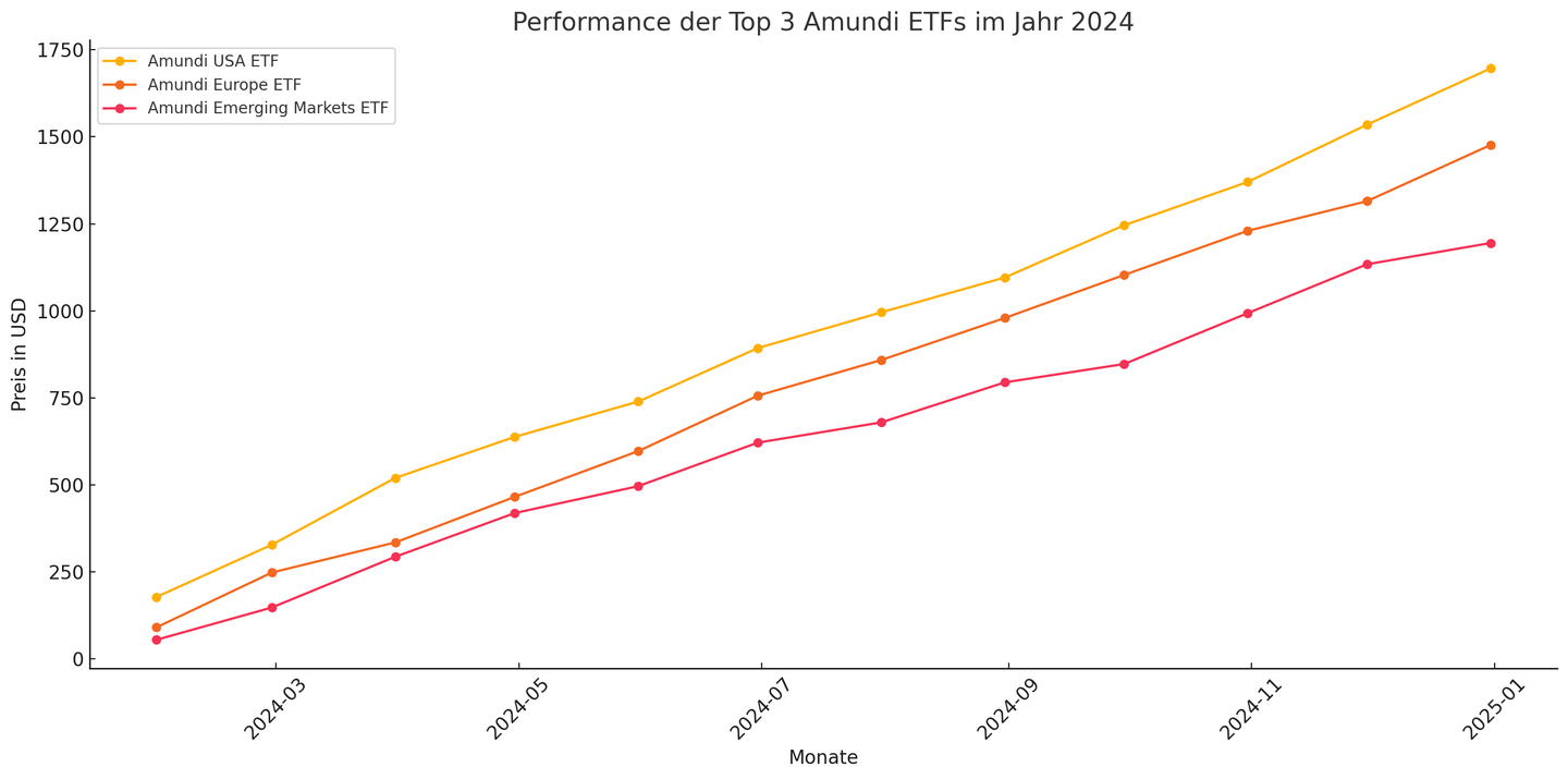 Hier ist das Kurvendiagramm, das die Performance der drei Amundi ETFs im Jahr 2024 zeigt