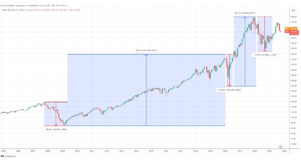 Im folgenden Abschnitt analysieren wir einen Chart des S&P 500, der die bullischen und bärischen Marktphasen der letzten 15 Jahre darstellt. Hier werden wir untersuchen, welche Ansätze und Strategien Anleger in Aufwärts- und Abwärtsmärkten verfolgen können.