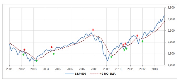 Hier sehen wir ein Beispiel der Signale, die dieses System zwischen 2001 und 2013 generiert hätte.