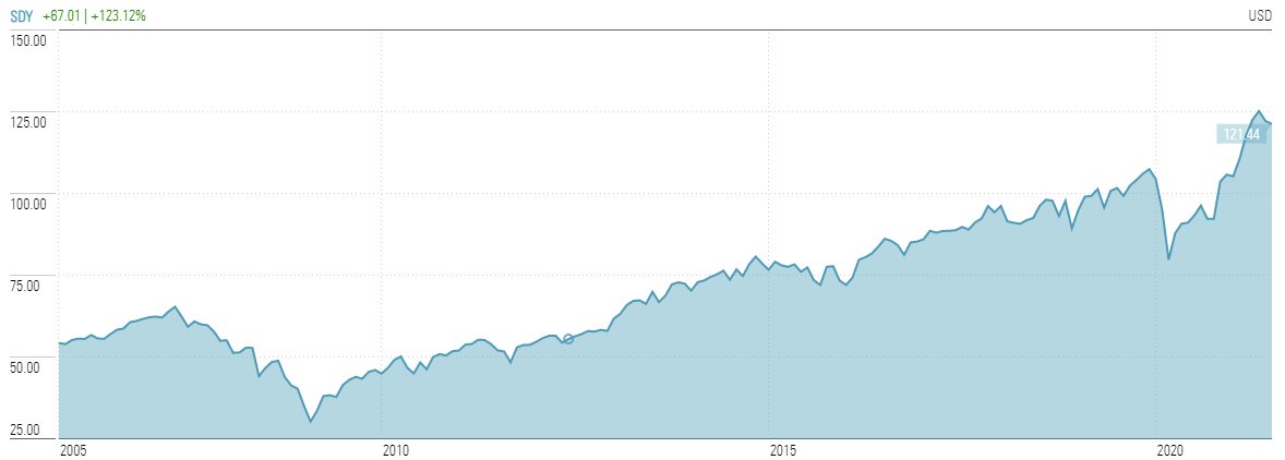 Der SPDR S&P Dividend ETF zielt darauf ab, den S&P High Yield Dividend Aristocrats Index nachzubilden. Dieser Index besteht aus den 50 Unternehmen mit der höchsten Ausschüttungsrendite im S&P 1500 Index, die ihre Dividende in den letzten 25 Jahren jedes Jahr erhöht haben. Diese Fonds bieten eine attraktives Beteiligung in Mid- und Small-Cap-Unternehmen mit einer Gewichtung von fast einem Drittel des Gesamtportfolios.