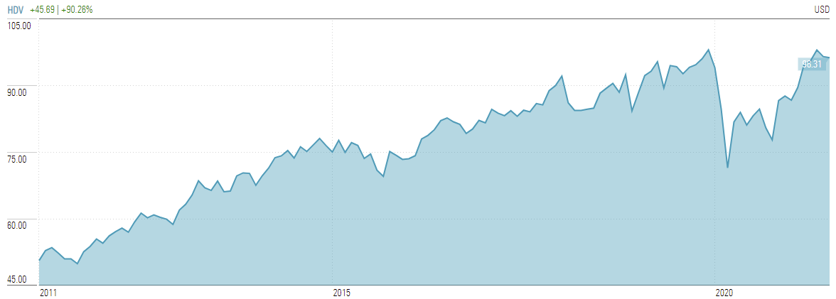 Der Vanguard High Dividend Yield ETF ähnelt dem oben besprochenen VIG-ETF-Fonds, aber anstatt sich auf die Beständigkeit der Dividendenausschüttung zu konzentrieren, investiert er ausschließlich in Unternehmen mit den höchsten Ausschüttungsrenditen. Sein Benchmark-Index ist der FTSE Global Equity Index Services.