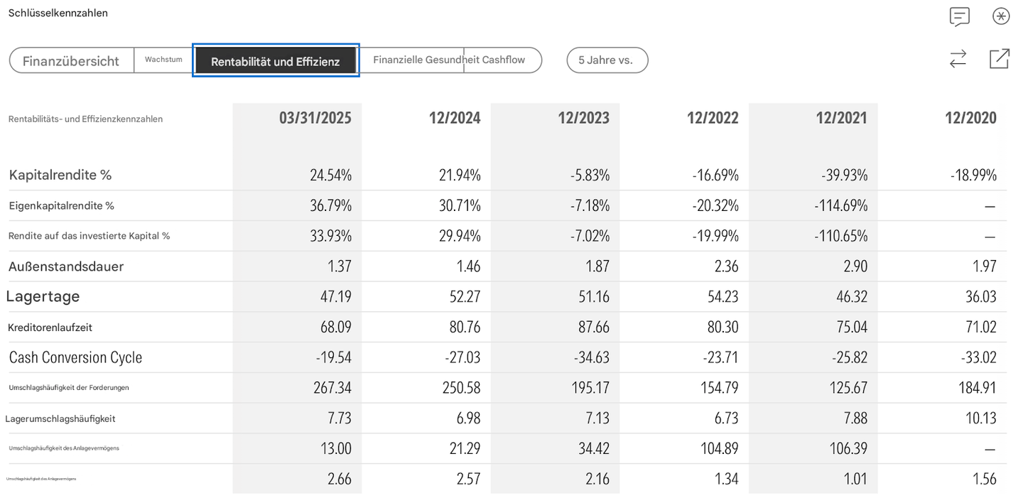 Das Kurs-Gewinn-Verhältnis (KGV) liegt bei über 200 - typisch für stark wachsende Technologieunternehmen, aber für Value-Investoren oft zu hoch. Dennoch sollten Sie bei der Bewertung von Tech Aktien im Wachstumssektor nicht nur auf das KGV achten, da dieses bei schnell wachsenden Unternehmen oft die Zukunftsaussichten widerspiegelt.