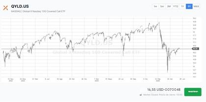 Das Overlay verkauft Call-Optionen auf Indizes/Aktien, die mit dem Nasdaq-100 verbunden sind, und die monatlichen Prämien, zusammen mit den Dividenden der Unternehmen, finanzieren die Ausschüttung an die Aktionäre (heute über 9 %). Im Gegenzug opfert der ETF einen Teil des Aufwärtspotenzials, wenn die Technologie boomt, weshalb wir beobachten können, dass er mehr oder weniger flach ist, sogar leicht im Minus, obwohl er mit weniger als einem Jahr Lebensdauer noch keine signifikante Historie aufweist