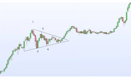 Im Falle eines Dreiecks mit bullischen Implikationen, dem ein Aufwärtstrend vorausgeht, muss Punkt 1 höher als Punkt 3 und Punkt 2 niedriger als Punkt 4 sein. Das Dreieck hat eine zeitliche Begrenzung für seine Bildung.