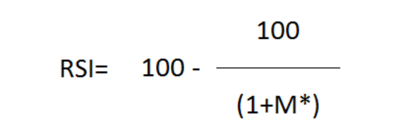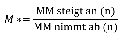 Wie man sieht, wird der RSI anhand des gleitenden Durchschnitts der Anstiege eines Wertpapiers oder eines Finanzinstruments innerhalb eines bestimmten Zeitraums berechnet (MM Anstiege (n)), wobei n die Anzahl der Perioden ist. Im Nenner von M* steht wiederum der gleitende Durchschnitt der Rückgänge oder Rückgänge (MM declines (n)).