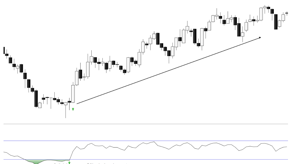 Wenn wir von einem Bruch sprechen, meinen wir eine Trendwende. Mit anderen Worten: Der RSI zeigt den Trendwechsel früher an als das Kurschart. Auf diese Weise sendet der RSI eine Warnung aus, die wir bestätigen können, sobald wir den Bruch der Kursdiagrammlinie sehen.