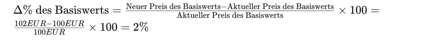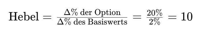Der Hebel einer Option wird berechnet, indem die prozentuale Änderung des Optionspreises durch die prozentuale Änderung des Basiswertpreises geteilt wird: