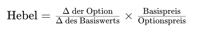 Ein alternativer Ansatz zur Berechnung des Hebels nutzt das Delta der Option. Das Delta gibt an, um wie viel sich der Preis der Option ändert, wenn sich der Preis des Basiswerts um eine Einheit ändert. Der Hebel wird dann berechnet als: