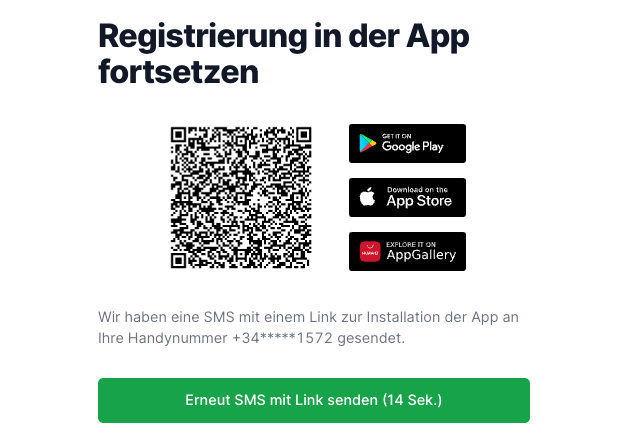 5. SMS-Verifizierung: Sie erhalten einen SMS zur Verifizierung, die Sie bestätigen müssen. Danach ist es am besten, mit dem Handy fortzufahren, indem Sie die App im Play Store oder App Store herunterladen.