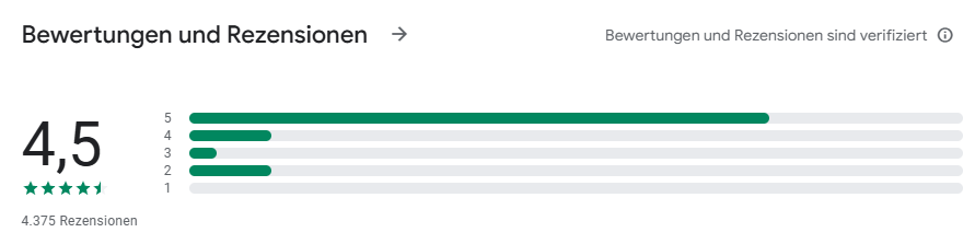 Ähnlich sieht es im Google Play Store aus, auch mit 4,5 Sternen bei über 4.300 Bewertungen.