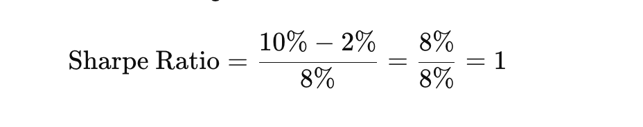 Angenommen, Ihr Portfolio erzielt eine durchschnittliche jährliche Rendite von 10% (Rp = 10%), der risikofreie Zinssatz beträgt 2% (Rf = 2%) und die Volatilität Ihres Portfolios liegt bei 8% (σp = 8%).