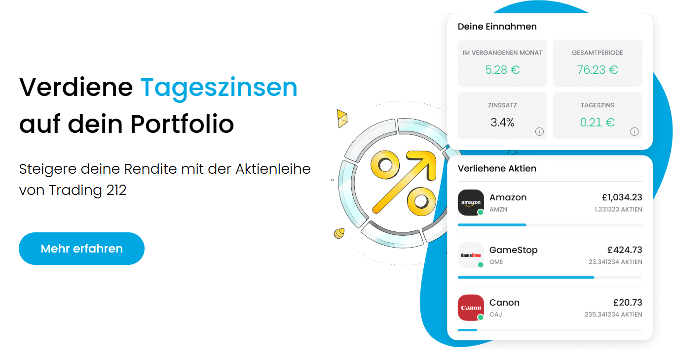 In der Regel führen Broker diese Praxis durch, ohne ihre Kunden um Erlaubnis zu fragen. Bei Trading212 hingegen können Sie dies nicht nur selbst entscheiden, sondern auch Zinsen dafür erhalten. Der Broker teilt die Gewinne dabei fair auf – jeweils 50 % gehen an den Verleiher und 50 % an den Broker. Diese Vereinbarung beeinträchtigt weder den Verkauf der Aktien noch den Erhalt von Dividenden.