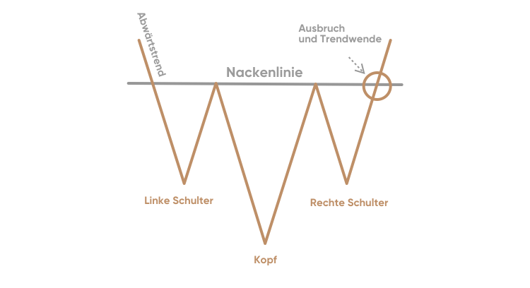 So wie es die Schulter-Kopf-Schulter-Formation gibt, gibt es auch die umgekehrte Schulter-Kopf-Schulter-Formation oder auch bullische Schulter-Kopf-Schulter-Formation genannt.