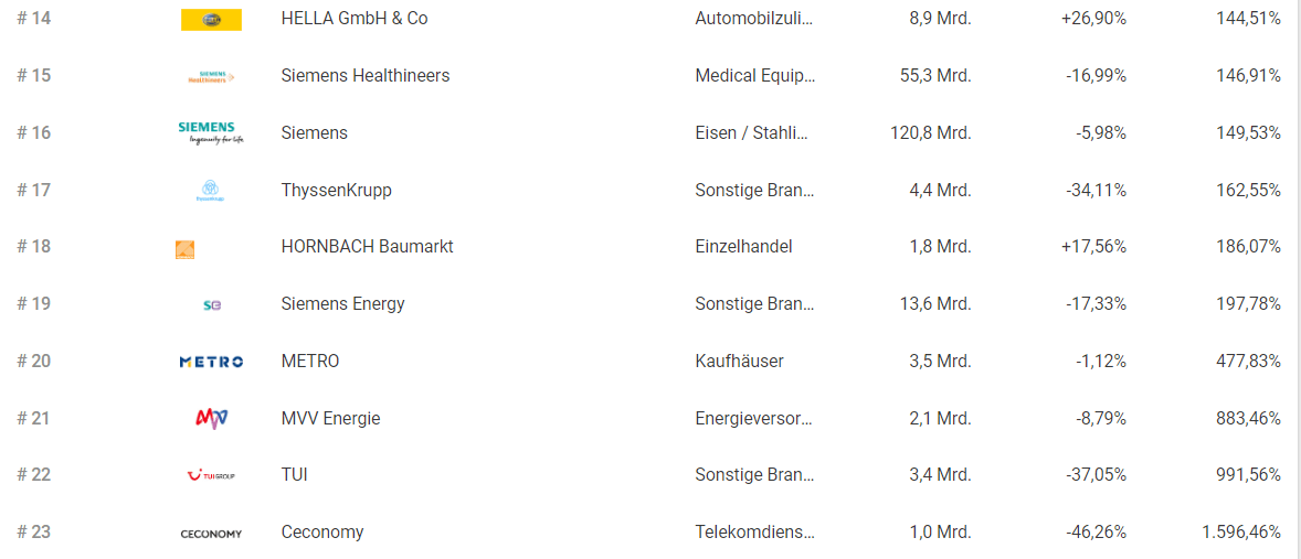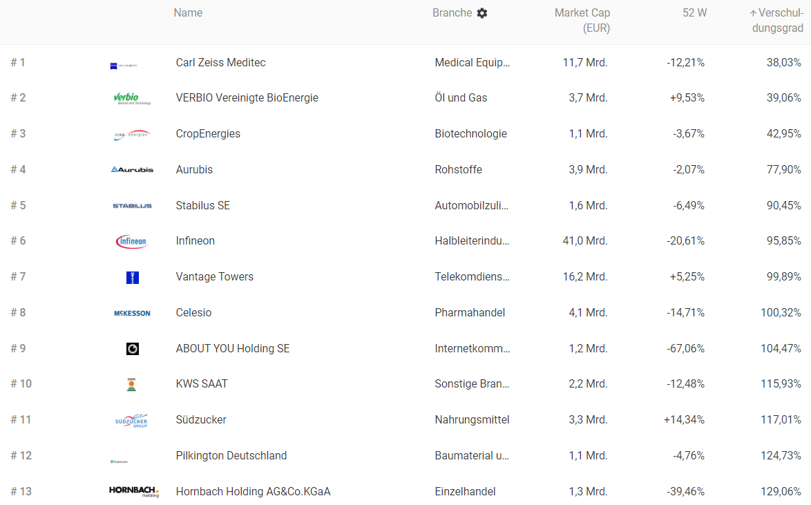 Quelle: Deutsche Aktiengesellschaften mit dem niedrigsten Verschuldungsgrad. Verhältnis Fremdkapital zu Eigenkapital; Marktkapitalisierung mindestens 1 Mrd. EUR. https://www.finanzen100.de
