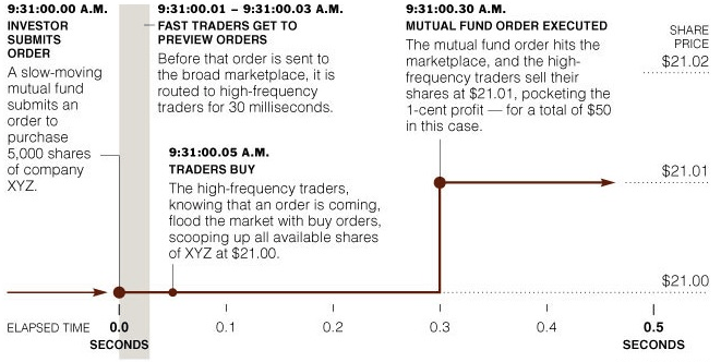 HFTs sollen die Auftragsinformationen erst dann erhalten, wenn der Auftrag auf einem Markt eintrifft, da sie sonst eine illegale Praxis, das so genannte "Front Running", ausüben würden.
